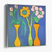 The central vase, in a striking green hue, proudly displays a large sunflower-like blossom in cheerful yellow, radiating warmth and happiness. Flanking it on either side are two orange vases, each boasting a unique floral composition: one with delicate pink blooms and the other with budding white flowers. The artist's style, reminiscent of Henri Matisse's cut-outs, features bold outlines and flat color areas, creating a visually striking and harmonious composition.