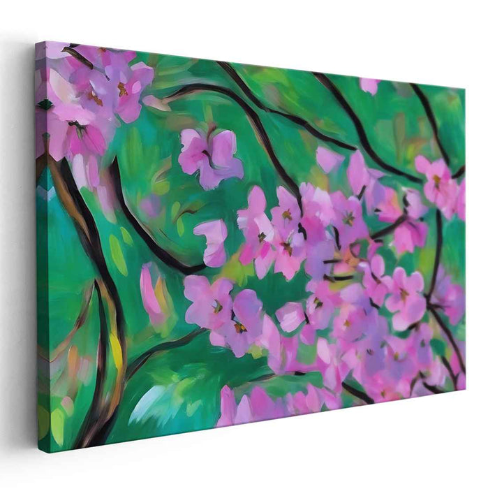 Immerse yourself in the serene beauty of 'Cherry Petal Tranquility: A Tranquil Cherry Blossom Impressionist Canvas Art Print'. This exquisite artwork captures the ephemeral beauty of cherry blossoms in full bloom, set against the rich, verdant backdrop of their foliage. The painting features soft, blush pink blossoms clustered along dark, sinuous branches that weave through the composition, creating a harmonious interplay of color and form. The blossoms are painted with a light, impressionistic touch, their delicate petals appearing almost translucent against the bold, emerald green leaves. This artwork exudes a peaceful, soothing atmosphere, enhanced by the gentle contrast between the pink of the flowers and the green of the leaves.