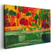 The painting showcases an abstract interpretation of buildings and trees, radiating a sense of vibrancy and life. The primary colors take center stage, with the striking reds and oranges of the buildings juxtaposed against the lush green foliage and tranquil blue-green water in the foreground. The reflections in the water add depth and movement, harmonizing the diverse colors and forms into a visually captivating masterpiece.