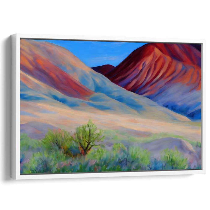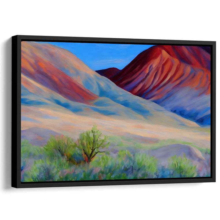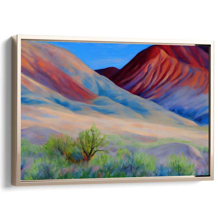 Immerse yourself in the captivating beauty of "Color Symphony Over Peaks: Vibrant Mountain Landscape Canvas Art Print," a striking landscape painting that transports you to a serene desert oasis bursting with vibrant hues and awe-inspiring scenery. This mesmerizing artwork features a lush green bush in the foreground, a refreshing pop of color against the arid backdrop, leading the eye to rolling hills of sandy beige and muted blues that gracefully guide your gaze towards the majestic mountains in the distance.