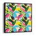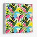 The canvas showcases an intricate pattern of stylized birds and tropical flowers, each element brought to life in vivid hues of pink, blue, green, and black set against a soothing cream background. The birds, depicted with sleek, abstract shapes, exude a sense of movement and vitality, while the flowers infuse the piece with a pop of color and organic richness.