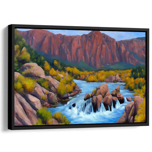 The artwork's primary colors feature deep blues mirroring the sky and river, harmoniously juxtaposed with the warm, earthy reds and oranges dominating the monumental rock formations. Complementing these are secondary hues of lush greens along the riverbank and delicate touches of yellow and purple in the foreground flora, creating a rich and immersive visual experience.