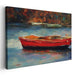 Crimson Vessel Serenity: Vivid Red Boat on Tranquil Lake Canvas Art