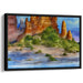 Step into the serene beauty of 'Desert Serenade Mirage: Watercolor Landscape of Arid Cliffs,' a captivating canvas art piece that transports you to a tranquil desert landscape where majestic rust-colored cliffs stand against a clear blue sky. The foreground showcases a verdant oasis with lush green trees, creating a striking contrast against the arid surroundings.