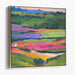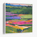The foreground of this masterpiece is a mosaic of intense pink, purple, and blue patches, reminiscent of blooming fields or wildflowers, seamlessly transitioning into lush greens and earthy tones that mirror the natural gradient of a flourishing valley. The sky, delicately washed in soft blues and greens, serves as a serene backdrop to the lively palette below, creating a harmonious symphony of colors that exude joy and vitality.
