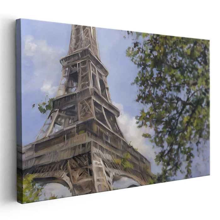 Introducing the stunning canvas art print, 'Eiffel Tower Elegance,' a mesmerizing portrayal of the iconic Eiffel Tower from a unique perspective that highlights its majestic presence against a tranquil sky. This artwork captures the intricate iron lattice of the architectural wonder with a perfect blend of realism and impressionistic strokes, showcasing the artist's exceptional skill in rendering both detail and emotion.