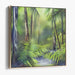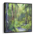 The artist has skillfully wielded a palette dominated by various shades of green, from deep emerald to soft moss, to capture the dense foliage of the rainforest. Subtle accents of brown and blue punctuate the canvas, enhancing the contrast and depth, illuminating the sturdy tree trunks and a tranquil stream meandering through the undergrowth.
