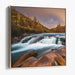 Set against the backdrop of an amber-hued forest under a twilight sky, the artwork showcases the forest bathed in the warm glow of sunset. Towering trees stand as silent sentinels, enveloping the scene in a peaceful wilderness ambiance. The composition skillfully guides the viewer's gaze along the river's dynamic journey, leading from the fiery foliage to the dusky sky, creating a harmonious visual narrative.