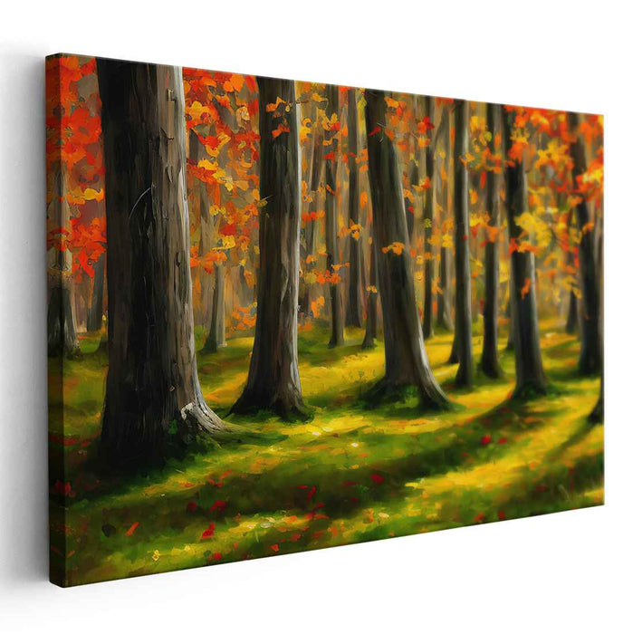 Introducing "Enchanted Glow Woods: Vibrant Forest," a mesmerizing canvas art print that immerses viewers in the heart of a captivating autumn forest. This enchanting scene is dominated by majestic trees reaching towards the sky, their earthy brown trunks anchoring the lush green forest floor. Delightful pops of red and orange from fallen leaves dance amidst the vibrant carpet of grass, while the foliage ablaze in autumnal hues of reds and yellows creates a breathtaking contrast against the verdant backdrop.