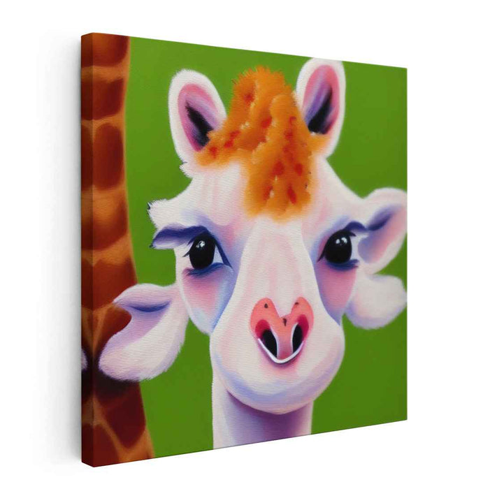 The artist employs a realistic yet slightly exaggerated style, highlighting the giraffe's oversized eyes and tufted fur atop its head. This technique infuses the artwork with a sense of innocence and playfulness, making it an ideal choice for spaces seeking a touch of whimsy and warmth.