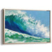 The wave's crest is a fusion of frothy whites and light blues, vividly portraying the foamy spray and immense force of the water. Transitioning into the body of the wave, deep blues merge seamlessly into vibrant aquamarines and teals, creating a captivating gradient that guides the viewer's gaze across the canvas. The serene sky-blue background offers a peaceful counterbalance to the ocean's turbulent energy, enhancing the overall visual impact.