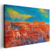 The canvas bursts with vivid shades of orange and red, vividly portraying the sunlit rock formations that dominate the scene. Complementing these striking colors are secondary hues of blues and greens, skillfully illustrating the expansive sky and distant landscape, creating a captivating interplay of depth and contrast.