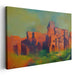 Introducing 'Ethereal Echoes in Time: A Luminous Vision of Ancient Ruins,' a mesmerizing canvas art that transports viewers to a historic realm of architectural grandeur illuminated by the golden embrace of a sunset. This captivating artwork skillfully weaves a rich palette dominated by fiery oranges, harmoniously balanced with tranquil teals and greens, creating a vivid contrast that elevates the painting's depth and allure.