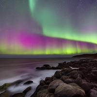 The primary colors of this piece, the lush greens and deep purples, blend harmoniously to paint a mesmerizing spectacle in the sky. Complemented by rich blues and delicate pinks, the night sky comes alive with depth and vibrancy, drawing viewers into a world of wonder and beauty. The meticulous detailing of the rocky shoreline and the gentle movement of the waves add a sense of realism and tranquility to the scene, showcasing the artist's skill in capturing textures and natural forms.