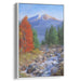 Introducing 'Fall Peak Tranquility: Serene Mountain Landscape with Autumn Foliage,' a captivating landscape painting that transports viewers to a serene mountain setting, showcasing nature's exquisite beauty under the soft embrace of early morning light. The focal point of this artwork is a majestic snow-capped mountain range, exuding a sense of tranquility and grandeur with its delicate shades of white and blue.