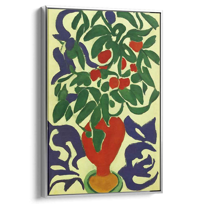 Introducing 'Fauvist Flourish,' a mesmerizing canvas art print that brings a burst of life and color into any space. This artwork showcases a vibrant depiction of a lush plant adorned with radiant red fruits, elegantly arranged in a bold red vase. The piece exudes a sense of vitality and joy through its bold colors and simplified forms, creating a harmonious blend of sophistication and playfulness.