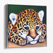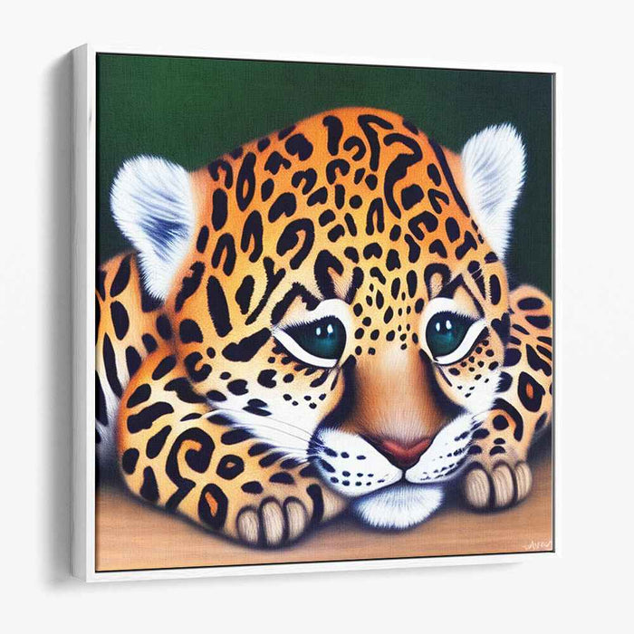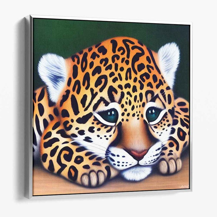 The young leopard's fur is a marvel of intricate detail, showcasing a symphony of rosettes and spots against a backdrop of luscious golden-yellow hues that exquisitely contrast with the deep, verdant greens of the jungle setting. The artist's hyper-realistic style meticulously renders the texture and softness of the leopard's coat, creating a tactile quality that invites viewers to immerse themselves in the artwork's lifelike beauty.
