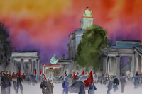 Introducing 'Fiery Skies Over Brandenburg,' a captivating watercolor painting that immerses viewers in a bustling city scene, possibly during a vibrant public gathering or protest. This artwork skillfully captures the iconic Brandenburg Gate against a backdrop of fiery orange and deep purple skies, evoking a sense of drama and urgency.