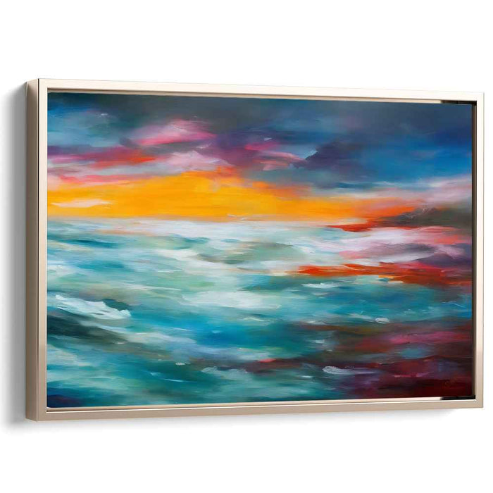 Introducing 'Fleeting Horizon Dreams: A Vivid Seascape in Oil,' a mesmerizing canvas art print that captures the dynamic harmony between the sea and the sky in a breathtaking sunset setting. This artwork portrays a captivating seascape where the turbulent ocean meets a fiery sky, creating a scene of unparalleled natural beauty and drama.