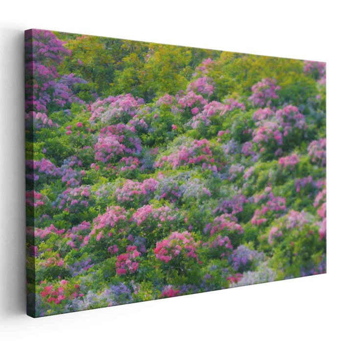 Introducing 'Fleurscape Reverie,' a mesmerizing canvas art print that transports viewers into a lush, vibrant landscape teeming with an abundance of blooming bushes. This enchanting artwork captures a rich tapestry of natural beauty, where vivid pinks and purples dance harmoniously amidst lush green foliage, creating a symphony of colors that mesmerizes the senses.