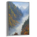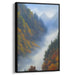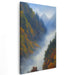 Introducing 'Foliage Tapestry,' an enchanting autumnal landscape canvas art print that immerses viewers in a tranquil mountainous setting shrouded in a gentle mist. The artwork captures a serene scene where a snow-capped peak emerges majestically from the fog, evoking feelings of peace and wonder.