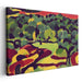The primary color palette of rich greens, deep purples, and reds evokes the dense foliage of the countryside, while bright yellows playfully interact with sunlight, creating a lively interplay of light and shadow. The artist's bold brushwork and abstract forms echo the Fauvist movement, known for its vibrant hues and expressive techniques, reminiscent of artists like Henri Matisse and Andre Derain.