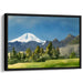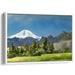 The focal point of the painting is the majestic snow-capped mountain, its pristine white peak towering proudly against the backdrop of the azure sky. The foreground comes alive with verdant green trees and a vibrant meadow, creating a striking yet balanced contrast with the rugged mountain range. The artist's use of watercolors infuses the piece with a soft, ethereal quality, achieved through delicate blending and subtle color transitions that enhance the overall tranquility of the composition.