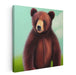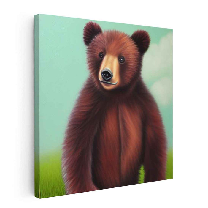 Introducing 'Gentle Wilderness: Heartwarming Bear,' a captivating bear canvas art print that transports viewers into a serene meadow, capturing the heartwarming essence of a young bear amidst nature's gentle charm. The artwork depicts a bear with rich brown fur and expressive eyes, standing vividly against a soft, pastel green backdrop that hints at a tranquil, sunny day.