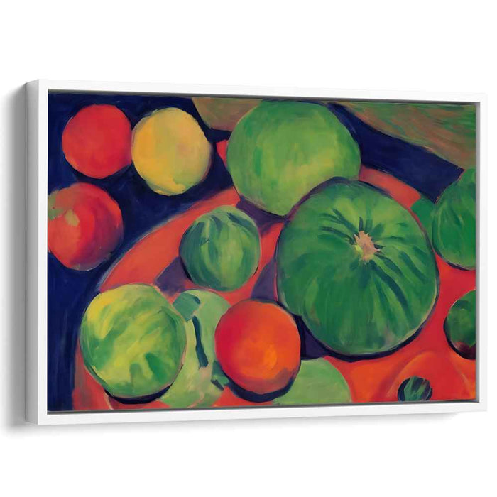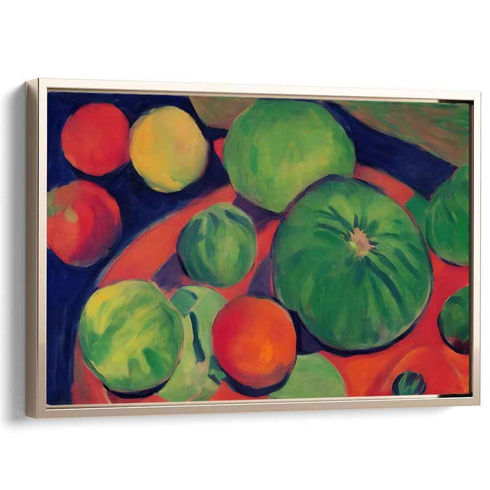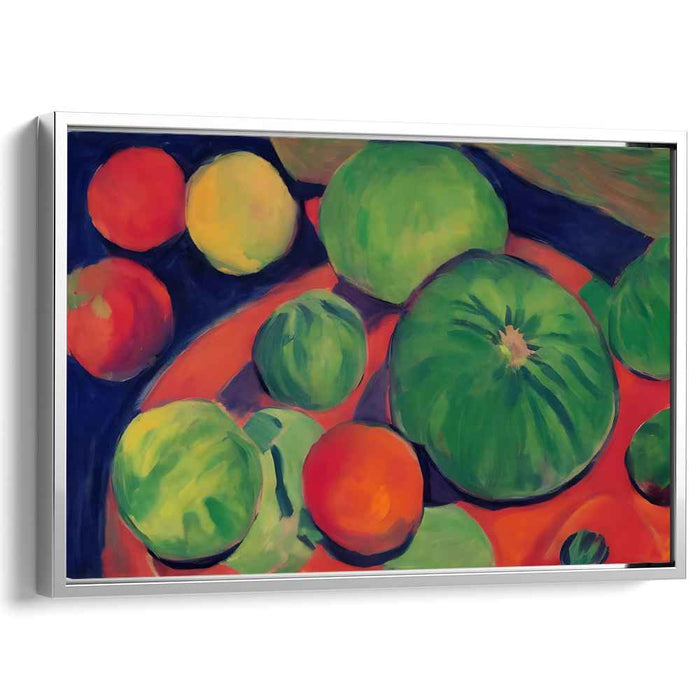 Introducing "Geometric Harvest Display: Modernist Still Life with Fruits," a captivating masterpiece that breathes life into a traditional still life composition, infusing it with a burst of contemporary energy and color. This dynamic artwork showcases a delightful array of fruits, including melons, oranges, and apples, depicted in bold and expressive brushstrokes that leap off the canvas with vigor and vitality.