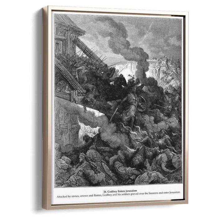 Step into the grandeur of Gustave Doré's iconic painting, "Godfrey Enters Jerusalem" (1877). This awe-inspiring masterpiece, now meticulously reproduced on high-quality canvas, transports you to the heart of a pivotal moment in history.