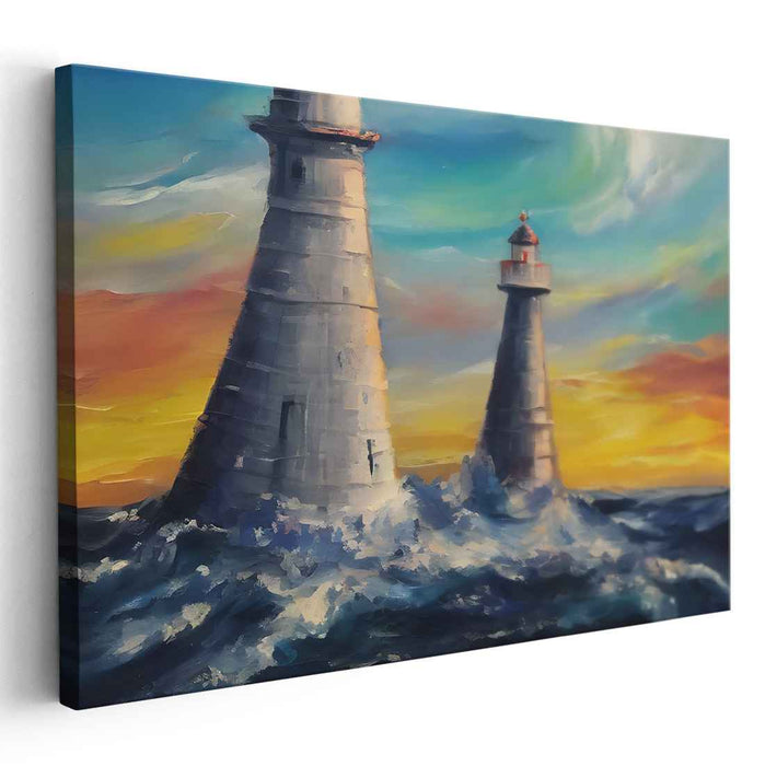 Introducing "Guiding Light Embraces Dusk Sea," a mesmerizing canvas art print that transports viewers to the edge of a tempestuous ocean, where two steadfast lighthouses stand tall against the roaring waves. This captivating artwork skillfully captures the play of light and shadow, as the sun's warm, golden hues clash with the deep, cool blues of the tumultuous sea.