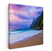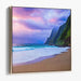 Immerse yourself in the serene beauty of 'Iridescent Oceans: Luminous Seascape Canvas Art'. This captivating artwork transports viewers to a pristine beach, where the grandeur of towering green cliffs meets the vibrant blues of the ocean. The scene is set under a mesmerizing sky, painted with hues of deep violet and soft pink, reflecting the early moments of dusk or dawn. The fine sand of the beach, touched by frothy white waves, adds a peaceful grounding element to the composition. The artwork brilliantly captures the dynamic interplay of natural light and landscape, showcasing the artist's skill in rendering detailed textures and atmospheric effects.