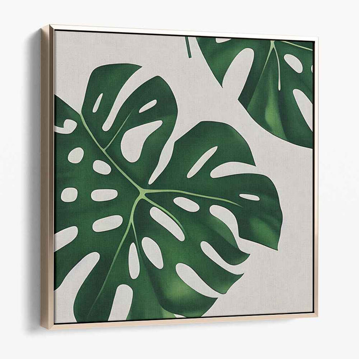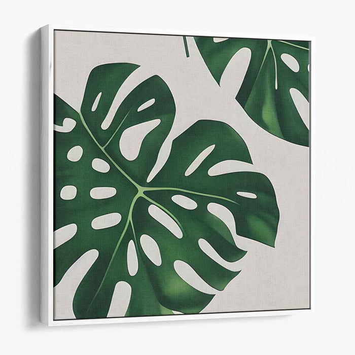 The canvas is dominated by the deep green Monstera leaves, exuding a sense of tropical elegance and natural allure. The rich primary color is accentuated by subtle gradients that infuse the foliage with depth and realism, while the clean, off-white background allows the green tones to pop vividly, creating a visually refreshing and calming ambiance.