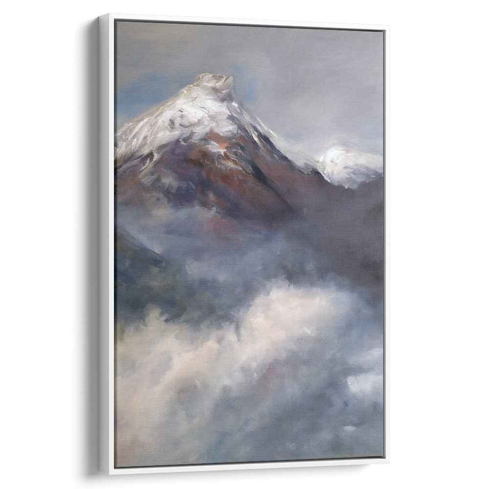 Introducing 'Majestic Mountain Summit,' a captivating canvas art piece that transports viewers to the awe-inspiring realm of a towering mountain embraced by ethereal clouds, evoking a serene and contemplative ambiance. This artwork showcases a majestic mountain peak, crowned with a delicate dusting of snow, proudly soaring against a soft and moody sky.