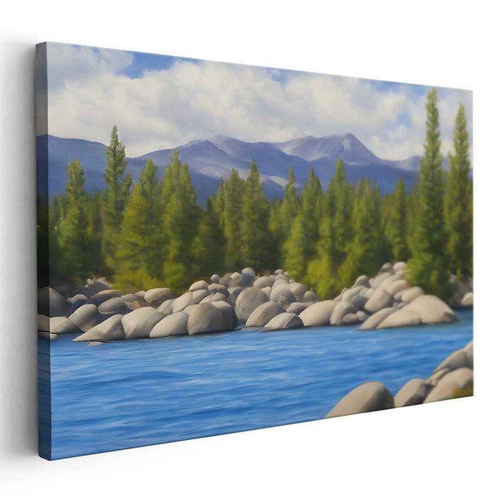 The foreground of this piece features a serene river bordered by smooth, rounded boulders, adding a tactile dimension to the composition. Across the river, a dense forest of towering pine trees stretches towards the horizon, their deep green foliage contrasting beautifully with the bright blue waters. In the background, majestic mountains rise, their peaks tinged with hints of purple and white, evoking a sense of a distant, snow-capped range under a partly cloudy sky.