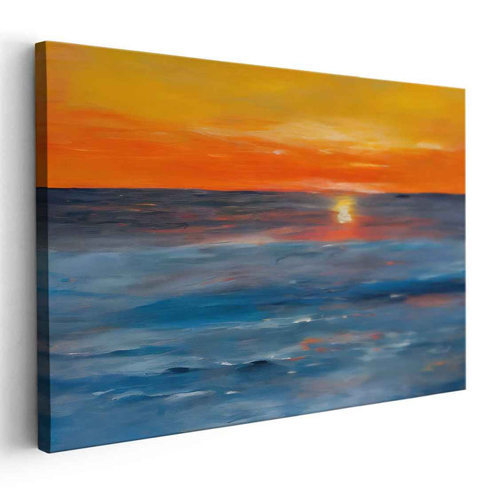 Introducing 'Marine Blaze: Ocean's Embrace in Fiery Hues,' a mesmerizing canvas art print that beautifully captures the serene beauty of a sunset over the ocean. This captivating artwork is a harmonious blend of warm and cool tones, with a vibrant orange dominating the scene alongside deep blues, reflecting the peaceful transition from day to night.