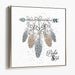 The feathers, predominantly in soft gray and white hues, elegantly hang from a twisted and beaded wire, creating a sense of delicate movement within the piece. Adorned with sporadic beads in tranquil turquoise and earthy tones, the dreamcatcher introduces a subtle pop of color against its neutral palette. Two stylized arrows crossing above incorporate patterns in turquoise and beige, enhancing the bohemian charm of the artwork.