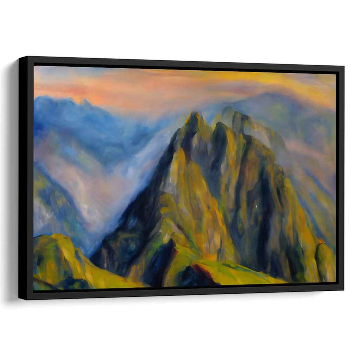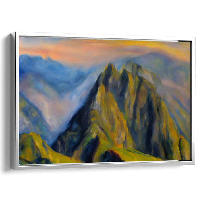 Introducing 'Misty Peak Awakening: Serene Mountain Landscape at Dawn,' a mesmerizing canvas art that transports you to a world of majestic mountains bathed in the ethereal light of dawn or dusk. This captivating piece showcases a rugged mountain range, its peaks jutting into the sky with a sense of grandeur and majesty.