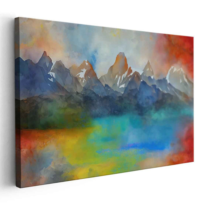 Immerse yourself in the ethereal beauty of 'Mountain Melody Splash: A Watercolor Symphony of Mountain Majesty,' a mesmerizing landscape canvas art that transports viewers to a realm of serene grandeur and vivid colors. This captivating artwork features a series of towering peaks, their jagged tips piercing a soft, dreamlike sky, creating a scene of majestic beauty.