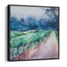 The artwork unfolds with a lush green field under a tumultuous blue and grey sky, hinting at an impending storm. A solitary farmhouse in the distance becomes the focal point amidst the vast openness, while a soft path in whites and pinks leads the viewer's gaze towards the house, embarking them on a visual journey through the countryside.
