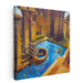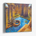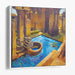 Immerse yourself in the architectural grandeur of 'Mystic Ruins by the Azure Waters,' a captivating canvas art print that transports viewers to an ancient world bathed in golden sunlight. This artwork masterfully depicts a serene scene set within the ruins of what appears to be an old temple or palace. The composition is dominated by towering columns and weathered stone structures, casting dramatic shadows and creating a play of light and dark that adds depth and intrigue. The central element of this piece is a tranquil, deep blue water pool, reflecting the golden hues of the stonework and the clear blue sky. Tiny details like a lone water lily floating on the surface of the water and intricate tile work lining the pool add a touch of delicate realism to the rugged textures of the stone. The use of perspective draws the viewer's eye towards the water, making it a vivid focal point against the warm browns and yellows of the ruins. This artwork, with its rich palette and meticulous attention to detail, evokes feelings of nostalgia and tranquility, perfect for inducing a contemplative mood in any space.