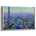 The artist has skillfully utilized a vibrant palette dominated by blues and greens, reflecting the intertwining waterways and lush greenery amidst the urban sprawl. This seamless fusion of nature and technology creates a visually stunning harmony, where the cityscape coexists harmoniously with the natural world.