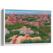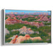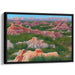 This artwork boasts a rich palette dominated by earthy tones, with lush greens and warm oranges taking center stage. Subtle hints of blue in the sky and soft pinks and purples in the distant hills add depth and dimension, infusing the piece with a sense of warmth and serenity.