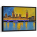 The artist skillfully employs a dynamic palette, with deep, rich blues dominating the depiction of the river and the sky, while a striking yellow-orange hue illuminates the intricate details of the Houses of Parliament. Soft purples and pinks accentuate the bridge, while subtle greens and reds bring depth to the clock tower, creating a harmonious interplay of colors that infuse the scene with energy and vibrancy.