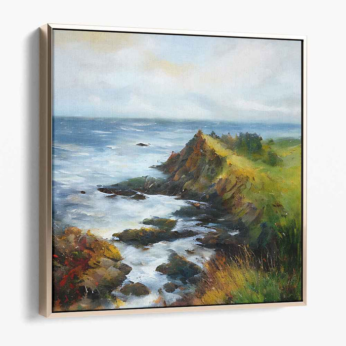 Introducing 'Ocean Whisperings,' an awe-inspiring coastal landscape canvas art that transports you to the untamed beauty of a rocky seaside, where nature's raw power meets serene majesty. This striking artwork is a vibrant blend of colors and dynamic brushstrokes, vividly depicting a dramatic coastline under a brooding sky.