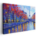 This artwork comes alive with bold and expressive brush strokes, infusing the scene with movement and vitality. The reflection of city lights on the tranquil waters adds a touch of magic, enhancing the overall charm and allure of the piece. Rich blues and purples dominate the color scheme, harmoniously juxtaposed with the warm hues of the foliage and streetlights, creating a visual symphony of color and contrast.