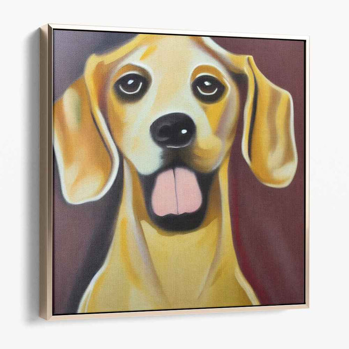 The primary color palette of this piece revolves around golden yellows, highlighting the dog's fur with a radiant glow. Soft browns and hints of white add depth and dimension to the portrait, creating a harmonious blend of warm tones that evoke a sense of coziness and familiarity. The muted, earthy brown background ensures that the focus remains on the dog's emotive face.