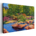 Introducing "Petal Cascade: Impressionist Landscape with Vibrant Flora and Serene Waters," a mesmerizing landscape canvas art that transports viewers to a serene riverside setting, capturing nature's exquisite beauty in vivid detail. This captivating artwork features a tranquil river meandering through the foreground, adorned with vibrant orange rocks that create a striking contrast against the deep blue waters.