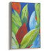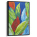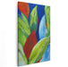 Introducing "Petals' Embrace," a mesmerizing abstract botanical canvas art print that bursts with vibrant energy and dynamic forms, offering a fresh and invigorating visual experience. This captivating artwork showcases a profusion of oversized, sweeping leaves painted in a kaleidoscope of colors, dominated by rich hues of green, red, and sky blue set against a deep, luscious blue background, creating a dramatic contrast that captivates the eye.