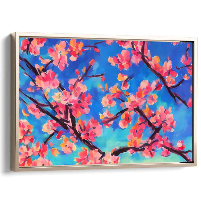Introducing 'Petals of Spring Essence,' a vibrant Impressionist canvas art print that encapsulates the essence of spring in a mesmerizing display of cherry blossom branches dancing against a vivid blue sky. This captivating artwork, created with bold brushstrokes and a bright color palette, vividly brings to life the beauty and renewal of nature in bloom.